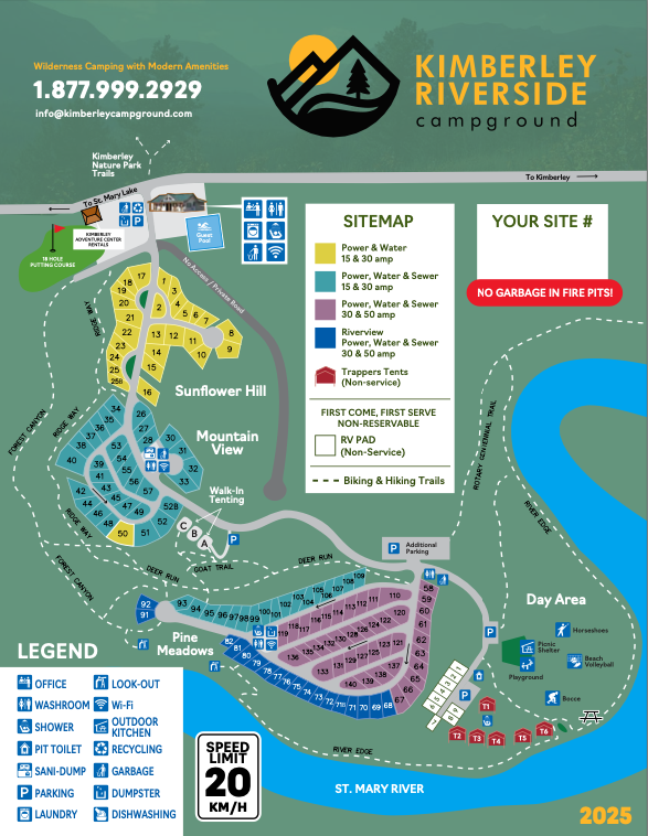 The Kimberley Riverside Campground has over 150 campsites that all offer their own quaint personality. You can enjoy anything from Full Serviced RV Sites to Walk-In Tent Sites.